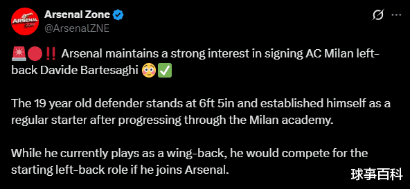 据意大利《米兰体育报》报道,阿森纳在一月转会窗开启前已对AC米兰后场球员巴尔泰萨吉产生了浓厚兴趣。枪手希望这个冬天把这位边后场球员带到英格兰。对枪手而言,这是一笔面向未来的精明投资,可在未来数年逐步培养。巴尔泰萨吉主打左后场球员,喜欢上下翻飞,必要时加入 攻击 ,将与卡拉菲奥里、刘易斯-斯凯利等人角逐 主力位置。