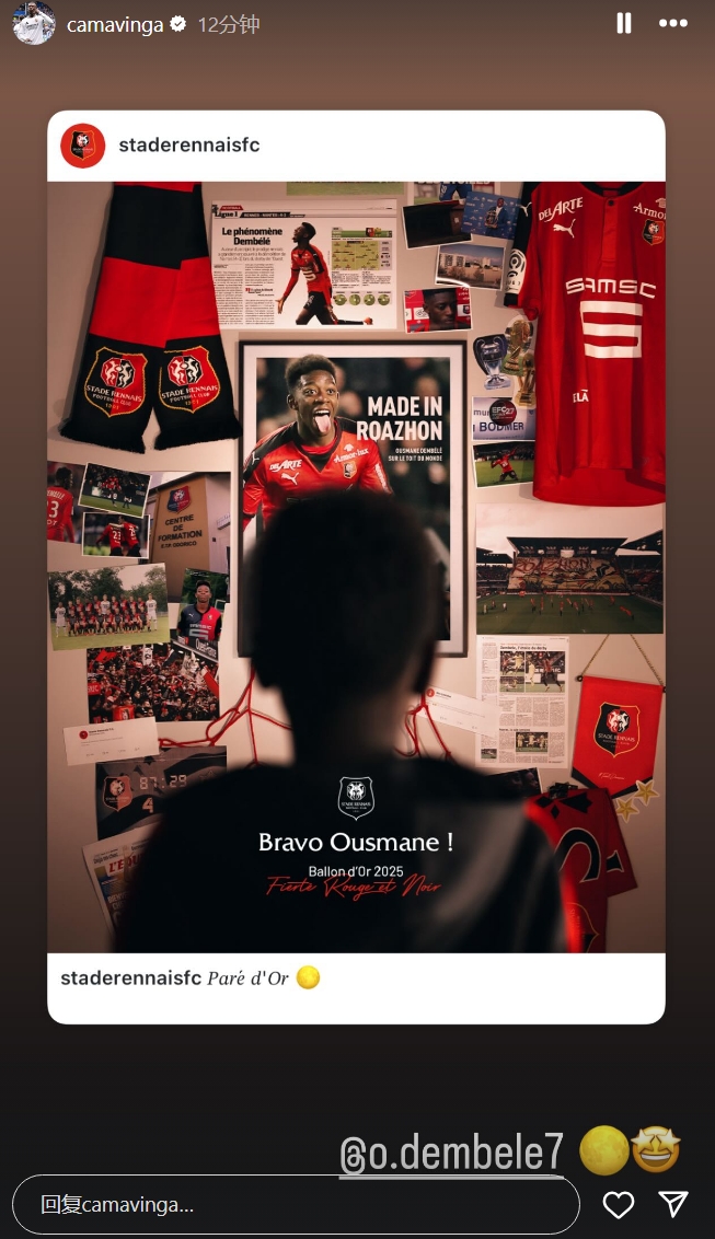 与登贝莱同样出身雷恩青训的卡马文加转发了雷恩的海报祝贺登贝莱获奖现场投注足球比赛。