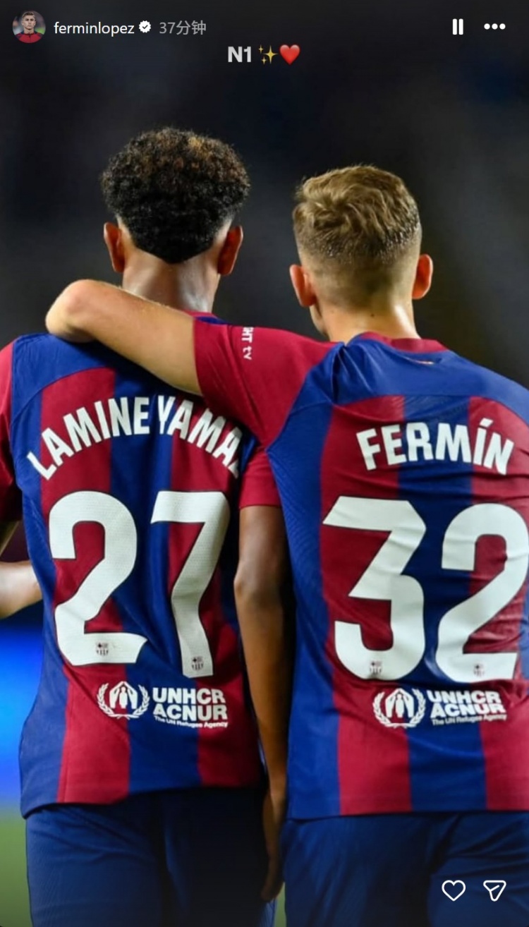 巴萨队友费尔明在个人社媒晒出与亚马尔的合影表示支持英超比赛直播在线,配文写道:“你就是No1!”