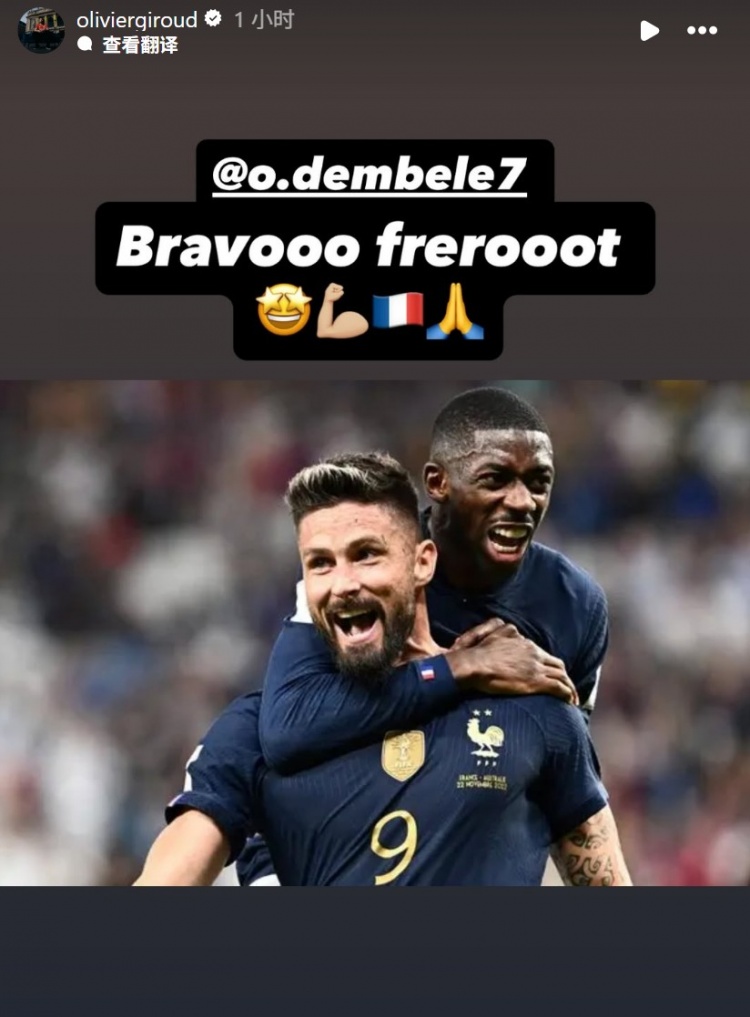 吉鲁社媒晒合影祝贺登贝莱夺金球奖:太棒了,我的兄弟!