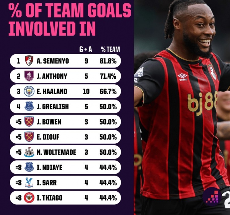10月8日讯 本赛季,伯恩茅斯翼锋塞梅尼奥延续了出色的竞技状态 ,他在球队攻击 中的重要性不言而喻。根据OPTA的数据统计 ,塞梅尼奥加入 得分 数占球队总得分 数的81.8%,为英超球员最高。