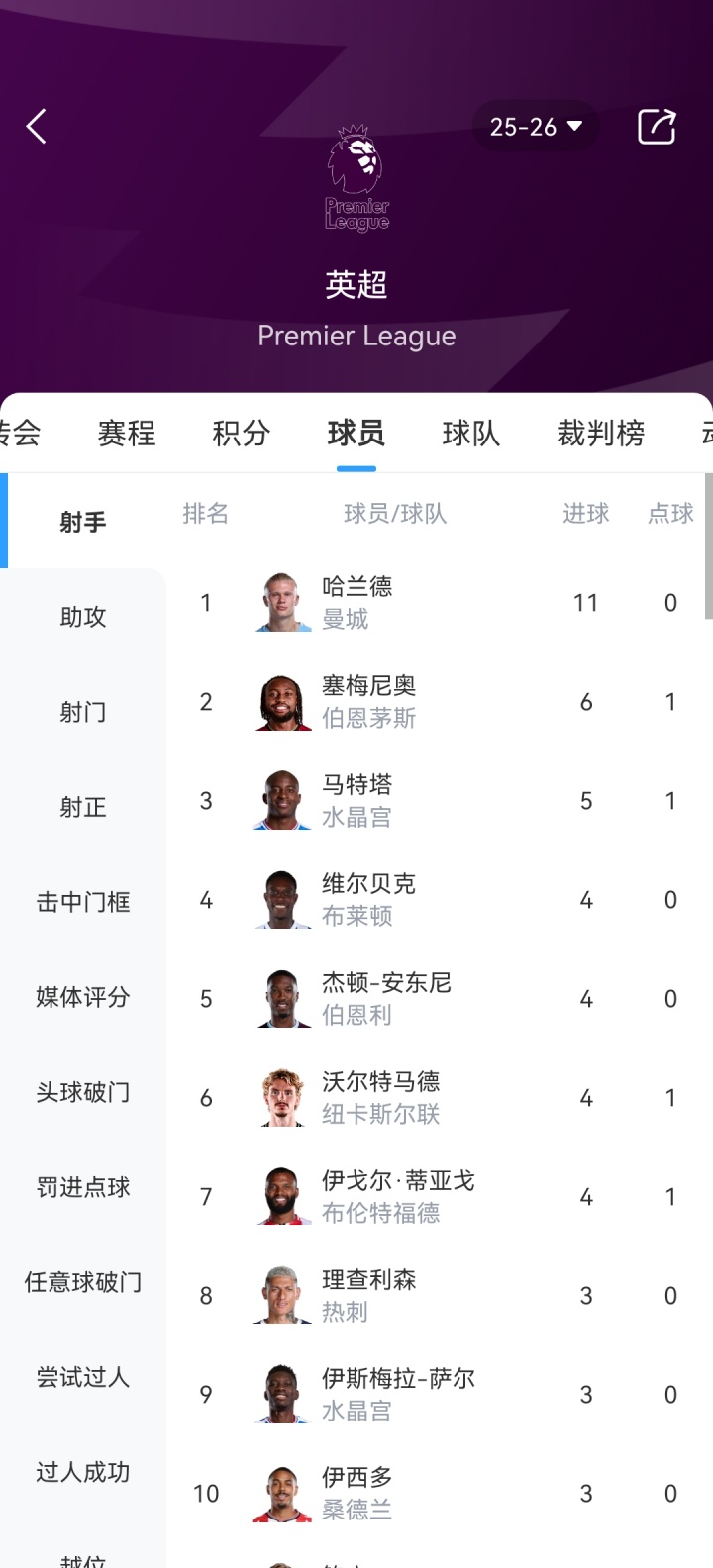 10月19日讯 英超第8轮部分赛事 结束,最新的英超射手榜:哈兰德11球领跑,本轮赛事 打进2球实现职业联赛 得分 数上双;塞梅尼奥6球第2,免费欧洲杯直播马特塔凭借本轮职业联赛 的独中三元得分 来到5个,在射手榜上位居第3名。维尔贝克、杰顿-安东尼、沃尔特马德、伊戈尔-蒂亚戈均打进4球,并列第4。