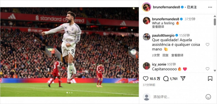10月20日讯 本轮英超焦点战,曼联2-1客获胜 物浦。赛后,足球直播无插件免费在线观看曼联领队 B费更新社媒庆祝获胜 。
