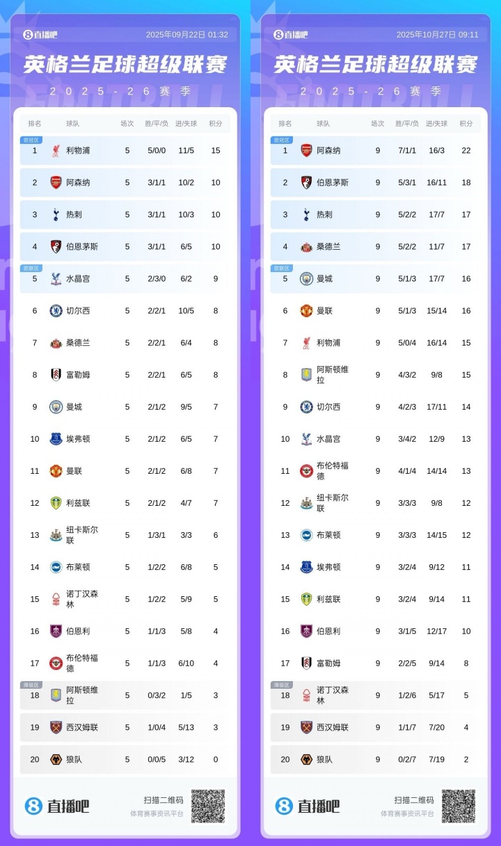 10月27日讯 英超第9轮全部战罢,积分榜上出现了有趣的一幕。