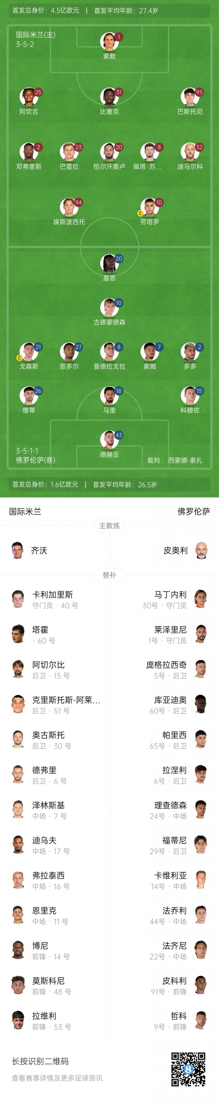 国际米兰杆位:1-索默、25-阿坎吉、31-比塞克、95-巴斯托尼、32-迪马尔科、2-邓弗里斯、23-巴雷拉、20-恰尔汗奥卢、8-苏契奇、94-埃斯波西托、10-劳塔罗