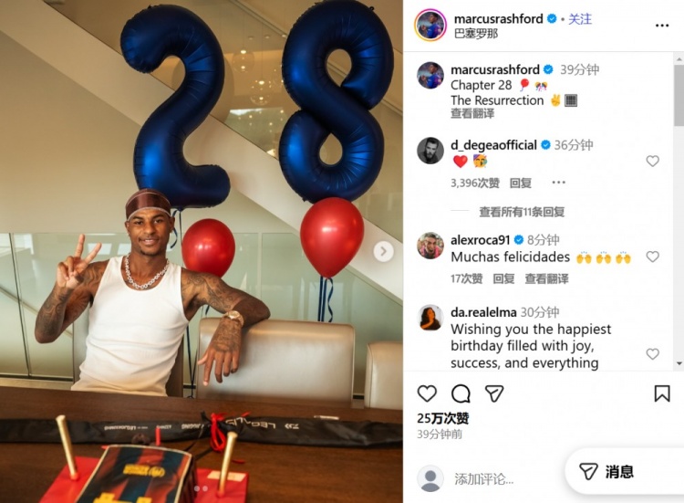 11月1日讯 10月31日是英格兰前场球员拉什福德28岁生日,在社交媒体上,这名被曼联外租至巴萨的射手写道:人生第28章!重生!